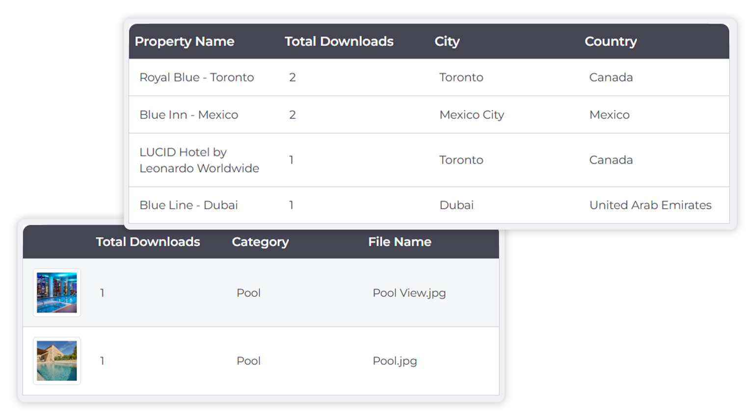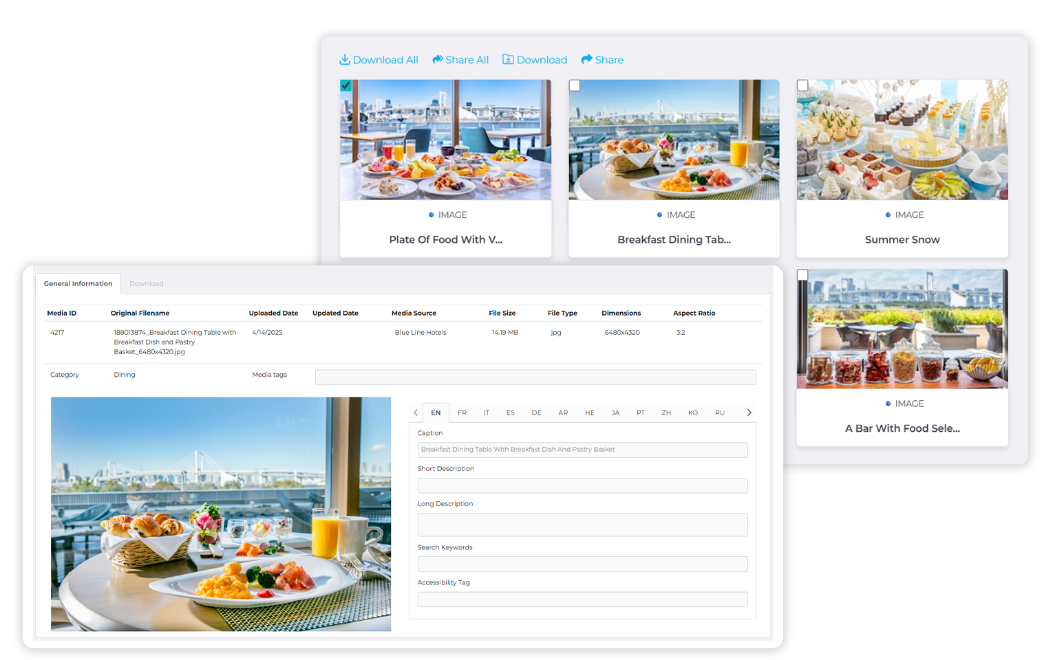 Bring every brand-approved asset together—images, videos, marketing copy, menus, and more. Organize your content by property, room type, restaurant, event space, or into custom collections. All in a branded, secure gallery that tracks access and usage.